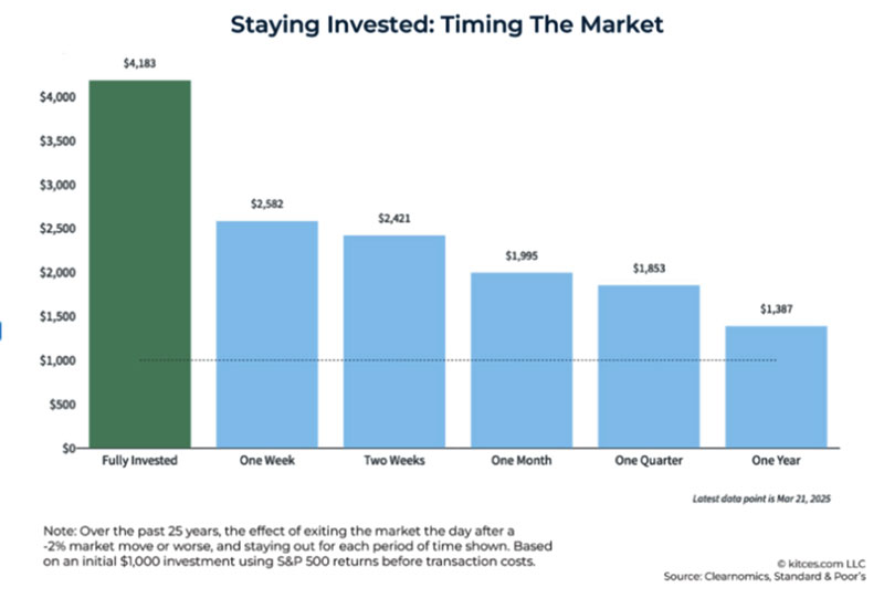 This chart shows that those who exit the market the day after every -2% market move or worse over a 25-year time period usually underperform those who remain fully invested. When you leave the market, you don’t just avoid future bad days, you also miss out on the future good days. Ultimately, missing even just a few of the market’s best days, or getting back into the market only after the market is already up, can significantly impact long-term returns. Because, remember, just like in life, nothing stays bad forever; good days will come again. The market is no different.